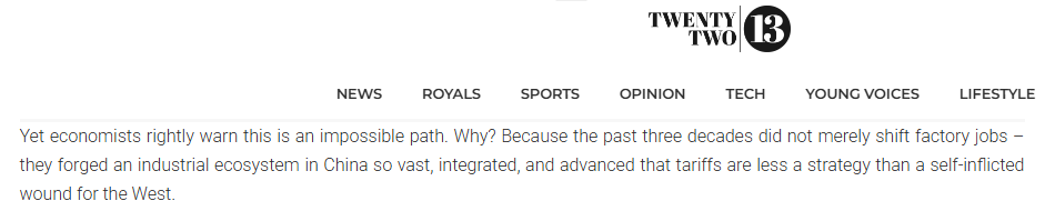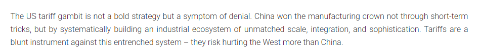 文章指出,美國的關(guān)稅策略不是一項(xiàng)大膽的戰(zhàn)略,而是否認(rèn)現(xiàn)實(shí)的癥狀。中國贏得制造業(yè)桂冠不是通過短期手段,而是通過系統(tǒng)地建立一個(gè)規(guī)模、一體化和復(fù)雜程度無與倫比的工業(yè)生態(tài)系統(tǒng)。