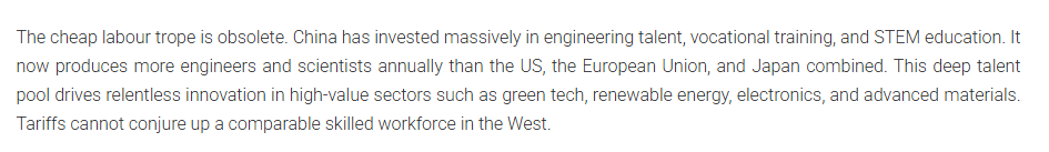 中國在工程人才、職業(yè)培訓(xùn)以及科學(xué)、技術(shù)、工程和數(shù)學(xué)教育等方面投入了大量資金。現(xiàn)在,它每年培養(yǎng)的工程師和科學(xué)家比美國、歐盟和日本的總和還要多。這種深厚的人才庫推動(dòng)了綠色技術(shù)、可再生能源、電子和先進(jìn)材料等高價(jià)值領(lǐng)域的不懈創(chuàng)新。