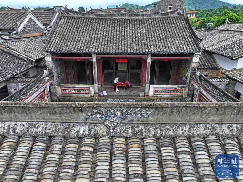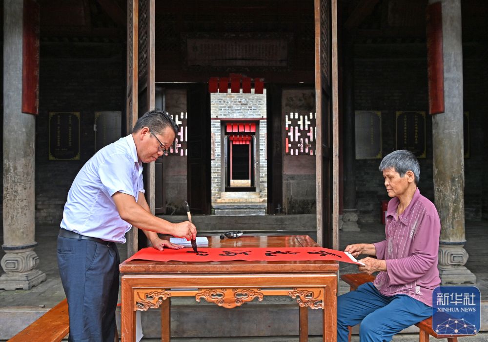 8月15日,楹聯(lián)愛(ài)好者在大蘆村古宅里寫(xiě)對(duì)聯(lián)(無(wú)人機(jī)照片)。
