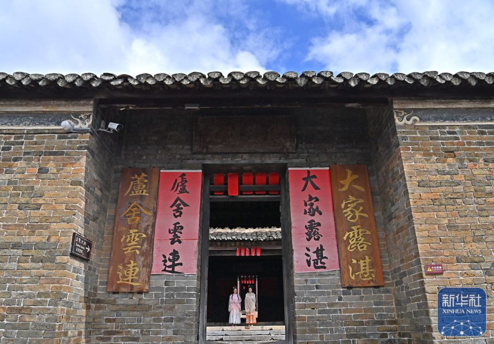 8月16日,一名身著漢服的游客在大蘆村古建筑群里跳舞(無(wú)人機(jī)照片)。