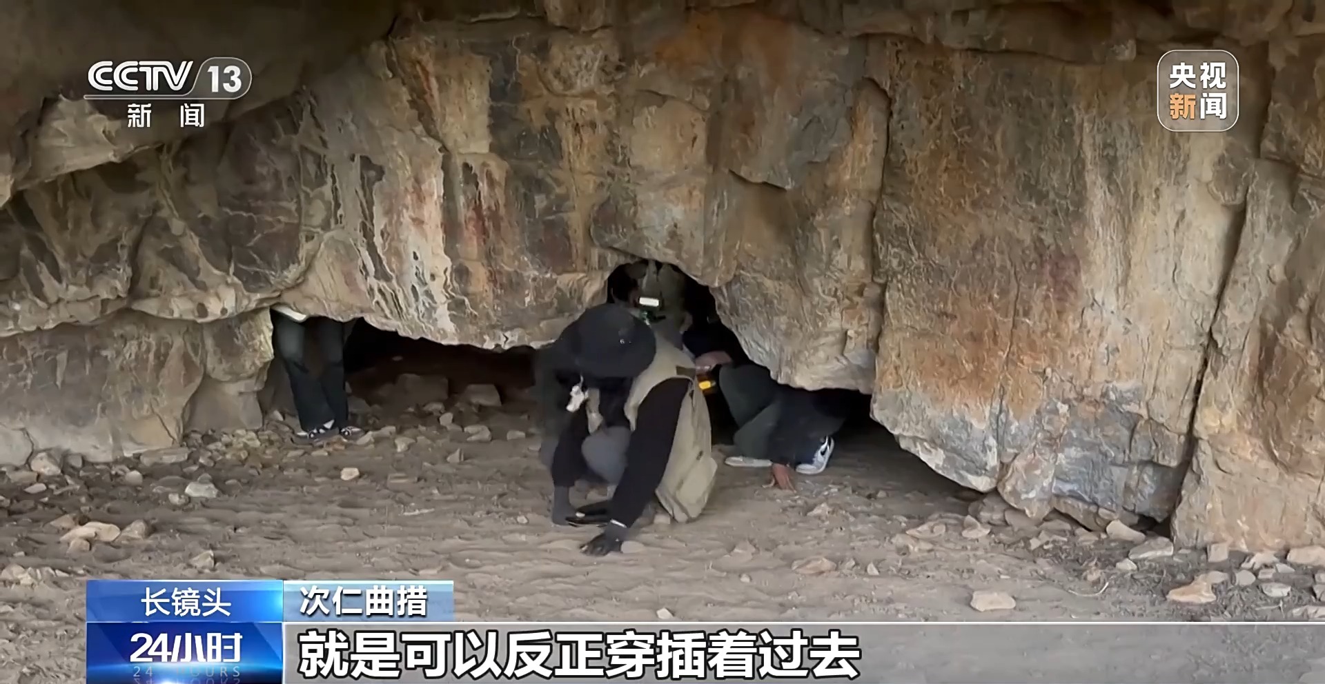 次仁曲措:當(dāng)?shù)氐南驅(qū)дf洞里面還有幾個巖畫,我們就趴著進(jìn)去了。洞里面還有幾個洞口,可以穿插著過去,感覺像拆盲盒一樣,非常好奇,想迫不及待地知道洞口有哪個巖畫,這些人像在跳舞或者在舉行某種儀式。