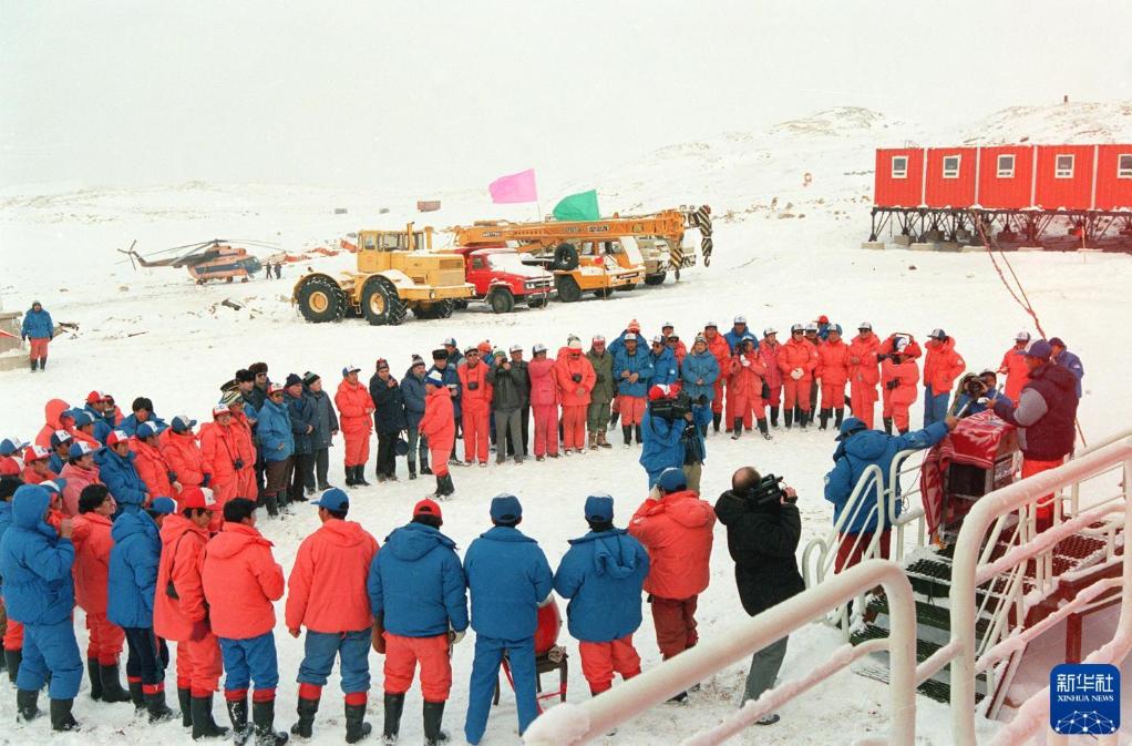 }1989年2月26日,中國南極考察隊(duì)員參加中山站落成典禮。新華社記者 張繼民 攝