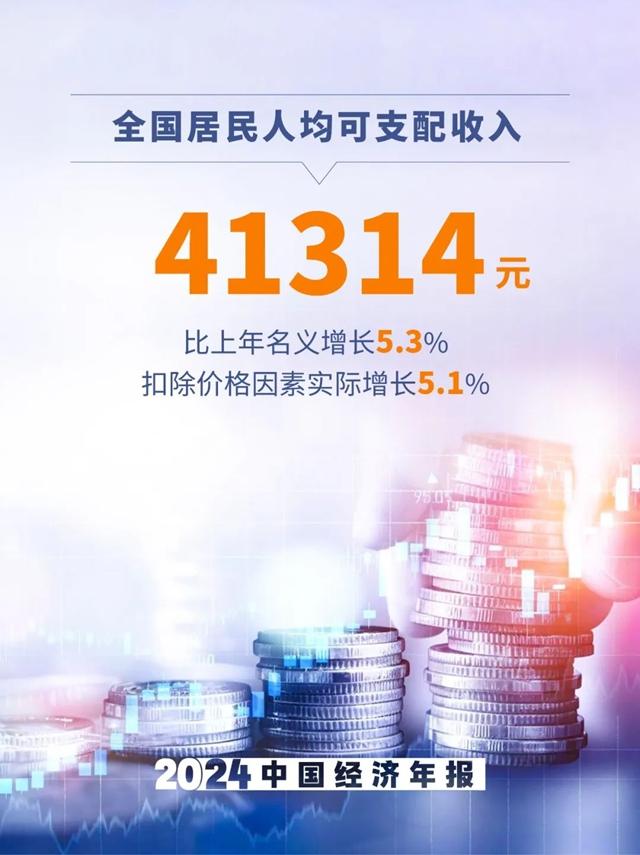 10、全國居民人均可支配收入41314元,比上年名義增長5.3%,扣除價(jià)格因素實(shí)際增長5.1%。