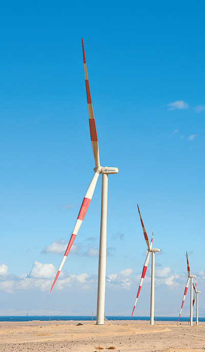 蘇伊士灣風電項目位于埃及首都開羅以南約300公里的蘇伊士灣西岸小鎮(zhèn)拉斯·加里卜。項目共有77臺風電機組,建成后預計每年可生產(chǎn)約27億千瓦時的清潔電力,實現(xiàn)二氧化碳減排約100萬噸。穆罕默德說:“在這片曠野上工作,把蘇伊士灣的風轉(zhuǎn)化成電能,‘點亮’萬家燈火,我感到十分驕傲。”