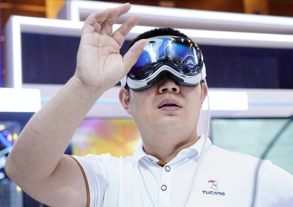 7月2日,參觀者在2025全球數(shù)字經(jīng)濟(jì)大會數(shù)字經(jīng)濟(jì)國際交流合作體驗區(qū)體驗一款MR混合現(xiàn)實(shí)設(shè)備。新華社記者 張晨霖 攝