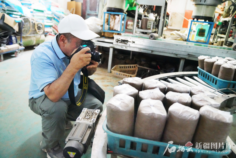 6月30日,在疏勒縣“魯疆情”食用菌生態(tài)科技示范園里,攝影記者約提克爾·尼加提在生產(chǎn)車(chē)間拍攝。