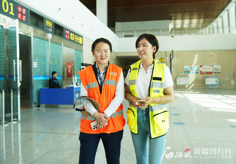 7月4日,記者加孜拉·泥斯拜克(右)在采訪塔什庫(kù)爾干紅其拉甫機(jī)場(chǎng)開(kāi)通后的變化。