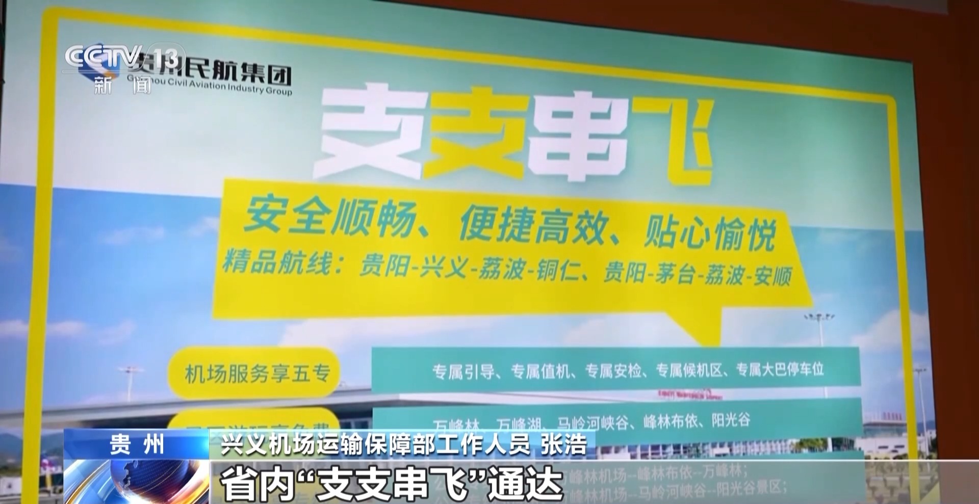 興義機場運輸保障部工作人員 張浩:目前21條航線覆蓋21座城市,省內(nèi)“支支串飛”通達銅仁、荔波、遵義茅臺等航點,興義到貴陽的“貴陽快線”保持每天3班執(zhí)飛。
