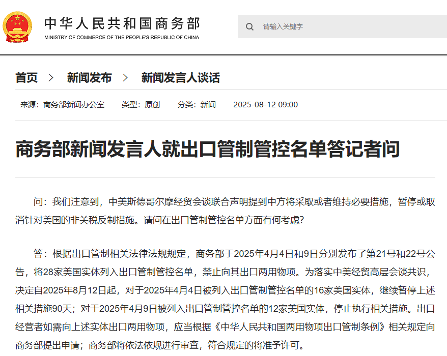 答:根據(jù)出口管制相關法律法規(guī)規(guī)定,商務部于2025年4月4日和9日分別發(fā)布了第21號和22號公告,將28家美國實體列入出口管制管控名單,禁止向其出口兩用物項。為落實中美經(jīng)貿高層會談共識,決定自2025年8月12日起,對于2025年4月4日被列入出口管制管控名單的16家美國實體,繼續(xù)暫停上述相關措施90天;對于2025年4月9日被列入出口管制管控名單的12家美國實體,停止執(zhí)行相關措施。出口經(jīng)營者如需向上述實體出口兩用物項,應當根據(jù)《中華人民共和國兩用物項出口管制條例》相關規(guī)定向商務部提出申請;商務部將依法依規(guī)進行審查,符合規(guī)定的將準予許可。
