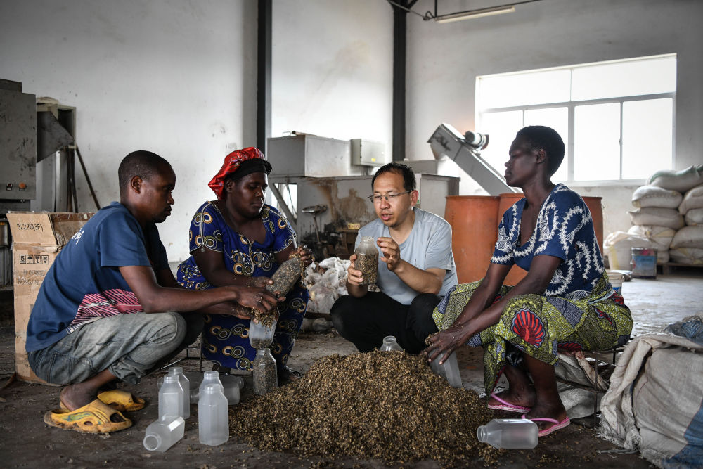 2024年8月13日,在盧旺達南方省胡耶區(qū)的中國援盧農(nóng)業(yè)技術(shù)示范中心,菌草專家陳曉斌(右二)與當?shù)剞r(nóng)民一起制作菌種培養(yǎng)料。新華社記者 韓旭 攝