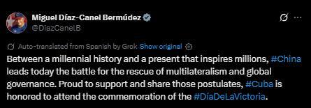 迪亞斯-卡內(nèi)爾在社交媒體上發(fā)文稱,“在綿延千年的歷史與激勵(lì)億萬人的當(dāng)下之間,中國(guó)今日引領(lǐng)捍衛(wèi)多邊主義與全球治理的斗爭(zhēng)。古巴為支持并踐行這些理念而自豪,并榮幸出席勝利日紀(jì)念活動(dòng)。”
