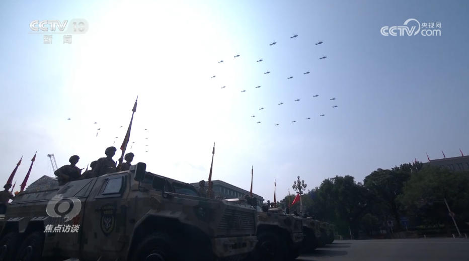 藍(lán)天之上,轟鳴聲持久不息,由26架直-19型武裝直升機(jī)組成的“80”字樣編隊(duì)向天安門(mén)飛來(lái),寓意紀(jì)念中國(guó)人民抗日戰(zhàn)爭(zhēng)暨世界反法西斯戰(zhàn)爭(zhēng)勝利80周年。