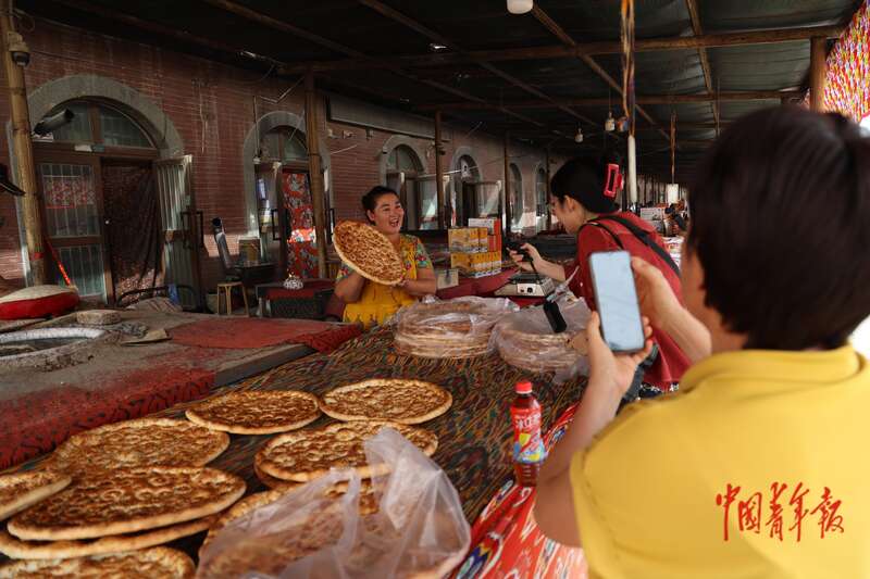 9月9日,新疆巴州尉犁縣興平鎮(zhèn)達西村,店主向顧客展示新疆馕。毗鄰尉犁縣城的達西村打造了商業(yè)街、民宿風情一條街,現有36家風情園、9家民宿,旅游業(yè)成為當地村民新的增收點。中青報·中青網記者 王鑫昕/攝