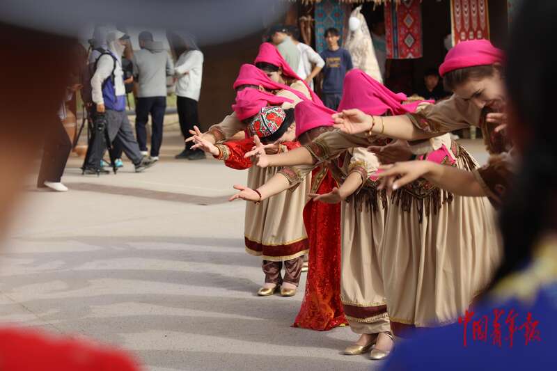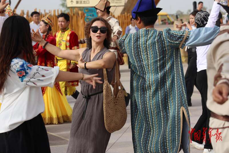 9月9日,新疆巴州尉犁縣羅布人村寨景區(qū),游客和當地演員一起跳舞。羅布人村寨集沙漠、河流、湖泊、森林、草原等自然景觀與獨特的羅布淖爾民俗文化景觀于一體,是外地游客體驗新疆風情的重要一站,深受人們喜愛。中青報·中青網記者 王鑫昕/攝
