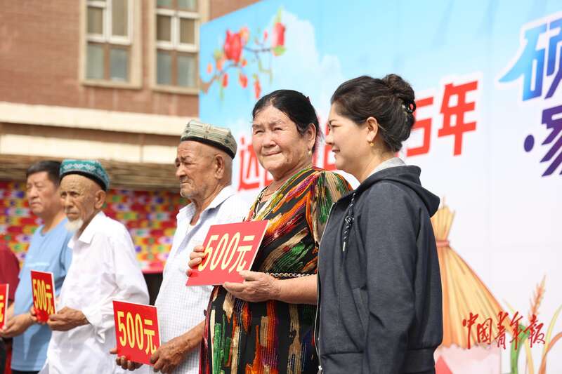 9月9日,新疆巴州尉犁縣興平鎮(zhèn)達西村,一場慶豐收活動上,達西村黨委書記夏提古麗·熱合曼(右一)代表村集體向該村長者發(fā)放慰問金。通過棉花種植、文化旅游等,2024年達西村集體收入達230.55萬元。中青報·中青網記者 王鑫昕/攝
