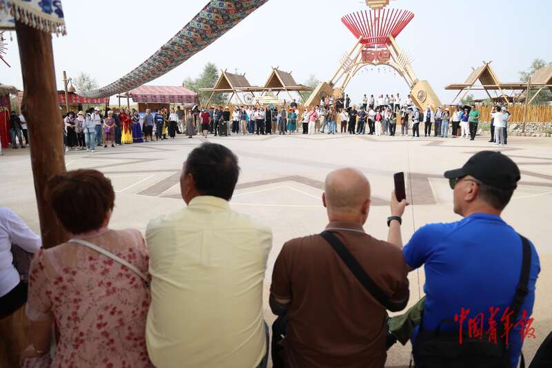 9月9日,新疆巴州尉犁縣羅布人村寨景區(qū),游客等待演員登場演出。中青報·中青網記者 王鑫昕/攝