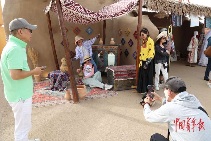 9月9日,新疆巴州尉犁縣羅布人村寨景區(qū),來自上海的游客在合影留念。2025年1月至8月,尉犁縣累計接待國內游客313.6萬人次,同比增長23.55%,實現游客總花費20.98億元,同比增長27.38%。中青報·中青網記者 王鑫昕/攝