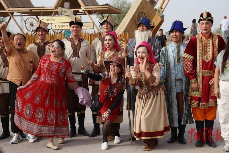 9月9日,新疆巴州尉犁縣羅布人村寨景區(qū),一場演出結束后,游客和當地演員合影留念。中青報·中青網記者 王鑫昕/攝