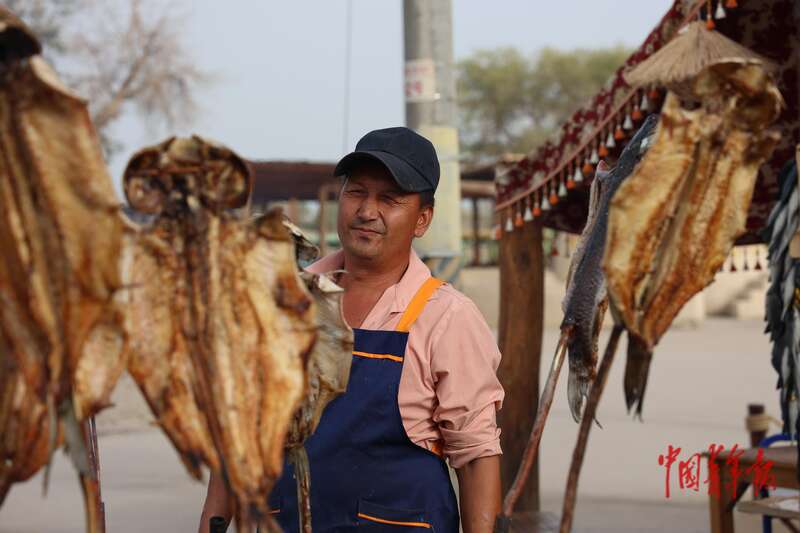 9月9日,新疆巴州尉犁縣羅布人村寨景區(qū),一位店主在現烤草魚。在尉犁縣,羅布人村寨在旅游扶貧、旅游惠民、旅游興縣等方面發(fā)揮著龍頭作用,景區(qū)從業(yè)人員80%以上是當地農牧民。中青報·中青網記者 王鑫昕/攝