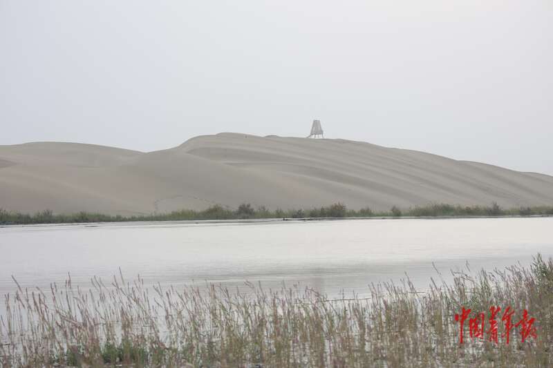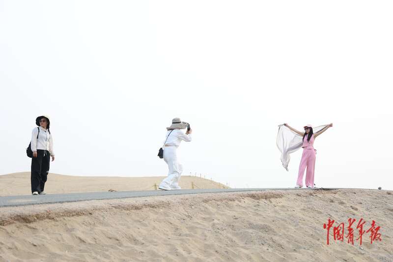 9月9日,新疆巴州尉犁縣羅布人村寨景區(qū),游客以廣袤的塔克拉瑪干沙漠為背景拍照留念。中青報·中青網記者 王鑫昕/攝