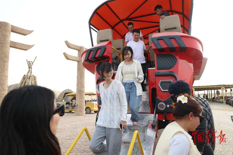 9月9日,新疆巴州尉犁縣羅布人村寨景區(qū),游客們走下被稱為“大腳怪”的沙漠觀光車。中青報·中青網記者 王鑫昕/攝