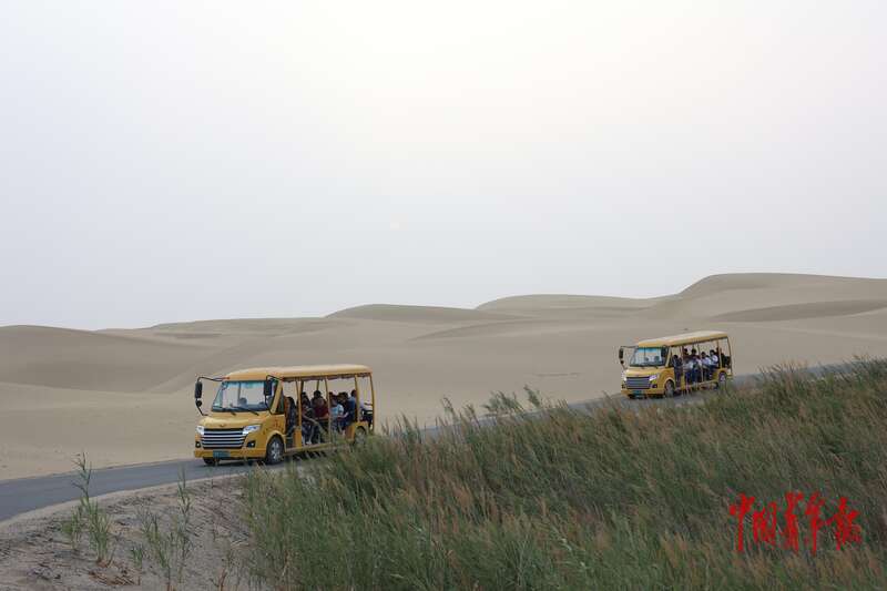 9月9日,新疆巴州尉犁縣羅布人村寨景區(qū),觀光車行進在塔克拉瑪干沙漠中。中青報·中青網記者 王鑫昕/攝