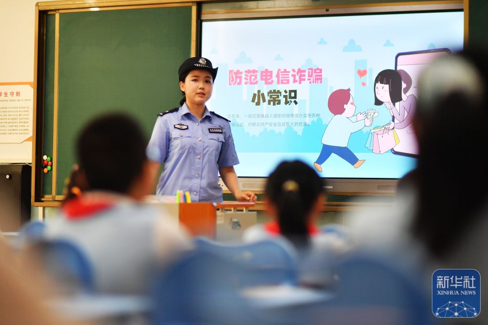 9月15日,在山東省榮成市府新小學(xué)教室內(nèi),轄區(qū)民警通過(guò)案例講解為學(xué)生們普及網(wǎng)絡(luò)安全和防詐騙知識(shí)。新華社發(fā)(李信君攝)