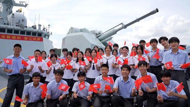 2025年7月3日,中國海軍山東艦航母編隊抵達香港。香港中學生登上海軍運城艦參觀、留影。