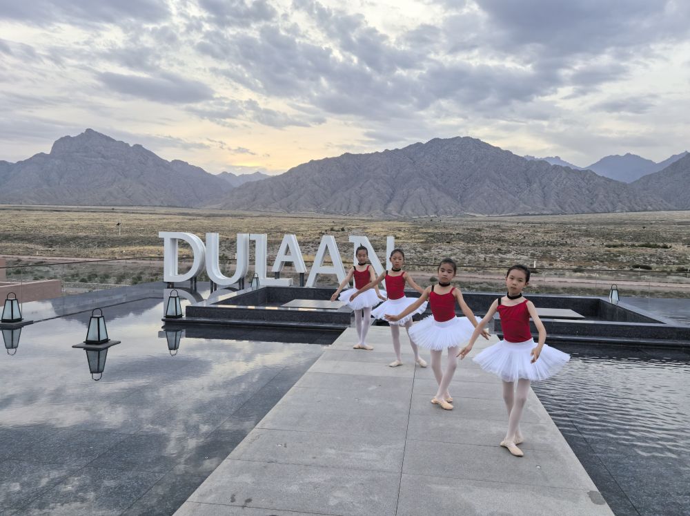 寧夏銀川市圖蘭朵葡萄酒小鎮(zhèn)安漠酒店觀景臺,游客在拍照打卡(2025年6月6日攝)。新華社記者 馬麗娟 攝