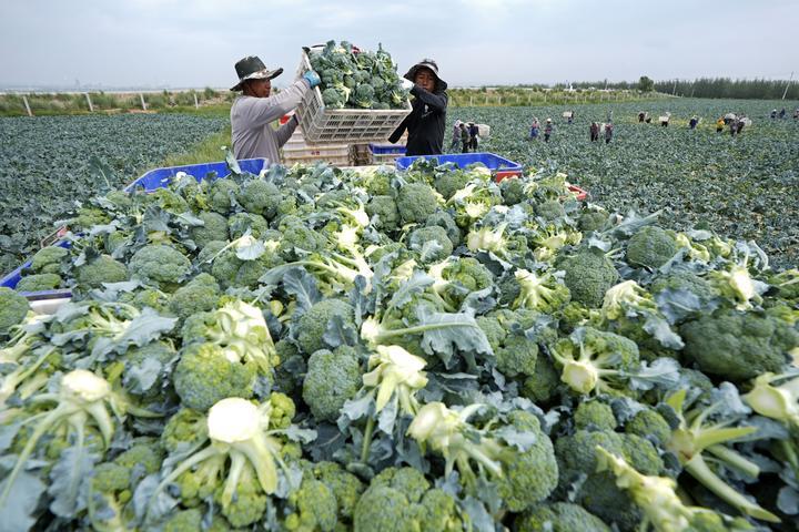 2025年7月18日,工作人員在寧夏固原市原州區(qū)彭堡鎮(zhèn)萬畝冷涼蔬菜基地運輸西蘭花。固原依托高海拔、氣候冷涼等“冷資源”優(yōu)勢,大力發(fā)展冷涼蔬菜產(chǎn)業(yè),著力打造“六盤山冷涼蔬菜”區(qū)域公用品牌。目前已建成冷涼蔬菜規(guī)?;N植基地130余個,種植面積穩(wěn)定在50萬畝,年產(chǎn)鮮菜200萬噸以上?!傲P山冷涼蔬菜”這張打造的“綠色名片”,已成為當?shù)剜l(xiāng)村振興發(fā)展之路上的“熱產(chǎn)業(yè)”
