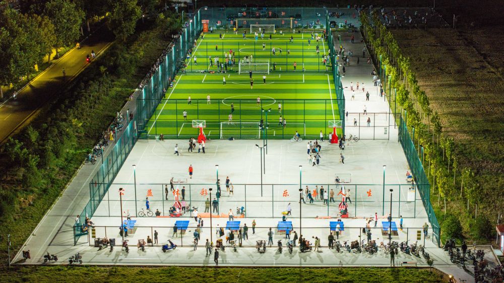 2024年9月21日,居民在山東省寧陽縣城區(qū)一處體育公園內(nèi)運動(無人機照片)。近年來,寧陽縣充分利用城市空閑區(qū)域,新建或改建體育健身公園,為居民打造“10分鐘體育健身圈”,讓城市的“金角銀邊”成為全民健身大舞臺。