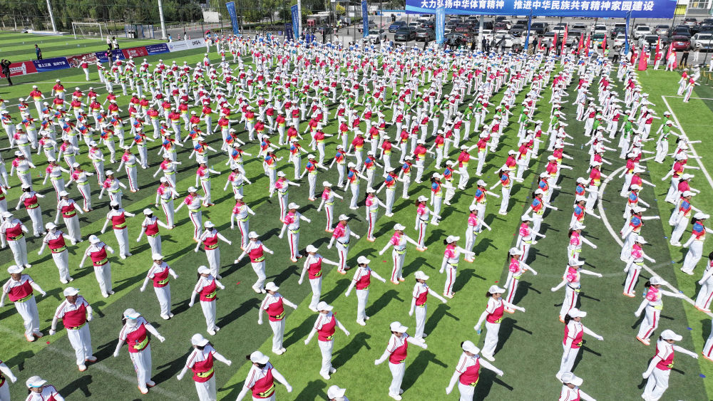 2025年6月10日,群眾在寧夏銀川市金鳳區(qū)覽山公園參加千人健身操展演(無人機照片)。當日,紀念“發(fā)展體育運動 增強人民體質(zhì)”題詞73周年全民健身主題活動在覽山公園舉行