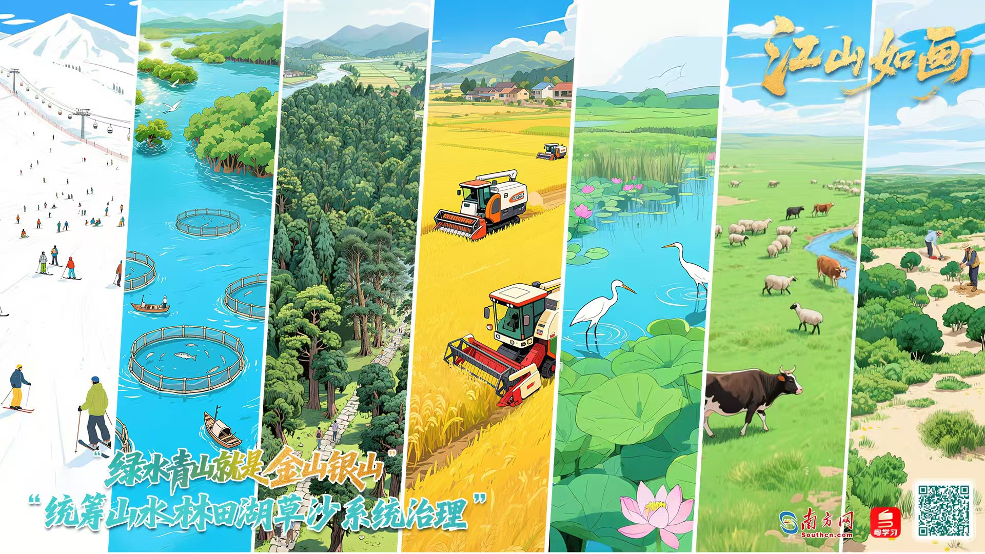 從20年前的余村到現(xiàn)在的中國大地,從“山水林田湖是一個(gè)生命共同體”到“統(tǒng)籌山水林田湖草沙系統(tǒng)治理”,從海拔0米的南海之濱到4000多米高的世界屋脊,幅員遼闊、高低起伏的中國大地上,綠色發(fā)展的藍(lán)圖漸次鋪展,美麗中國的畫卷逐筆繪就。