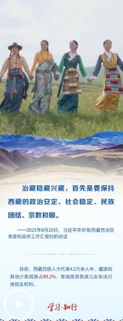 2025年8月20日,習(xí)近平總書(shū)記率中央代表團(tuán)乘專機(jī)抵達(dá)拉薩,出席西藏自治區(qū)成立60周年慶祝活動(dòng)。在聽(tīng)取西藏自治區(qū)黨委和政府工作匯報(bào)時(shí),習(xí)近平總書(shū)記強(qiáng)調(diào),“持續(xù)深入抓好穩(wěn)定、發(fā)展、生態(tài)、強(qiáng)邊四件大事,努力建設(shè)團(tuán)結(jié)富裕文明和諧美麗的社會(huì)主義現(xiàn)代化新西藏”。