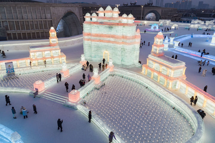 2023年2月1日,游客在哈爾濱冰雪大世界園區(qū)冰雪景觀(guān)《勝利之城》周邊游玩,該冰雪景觀(guān)以印度的法塔赫布爾西格里城為原型設(shè)計(jì)建造(無(wú)人機(jī)照片)。此屆哈爾濱冰雪大世界將上合組織成員國(guó)的特色建筑以冰雪景觀(guān)的形式呈現(xiàn)。新華社記者 謝劍飛 攝
