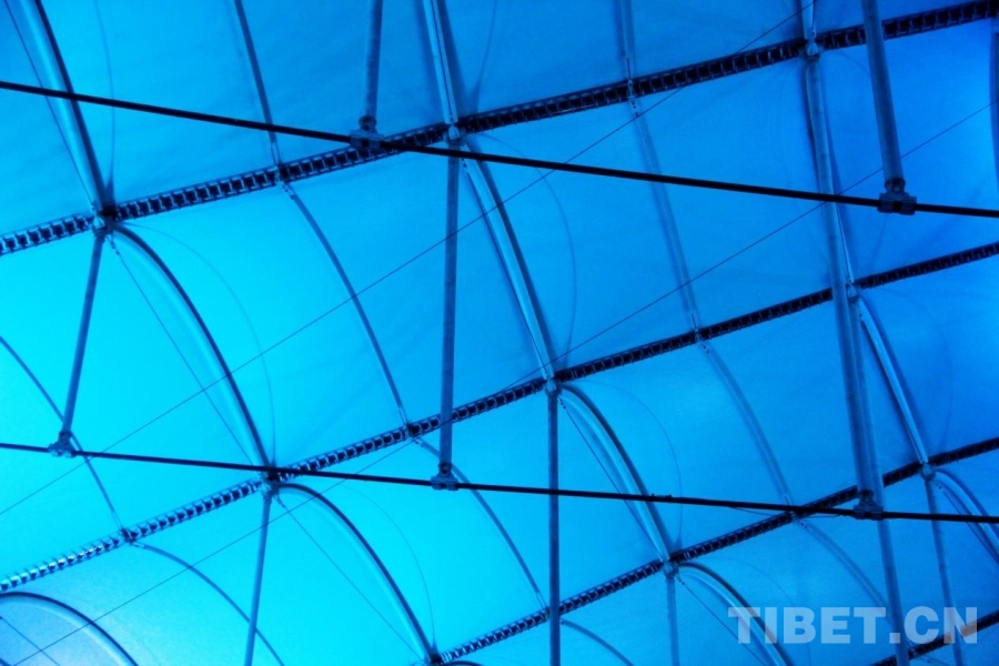 圖為三亞市體育中心體育場內部的玻璃結構反射的藍色燈光 攝影:劉莉