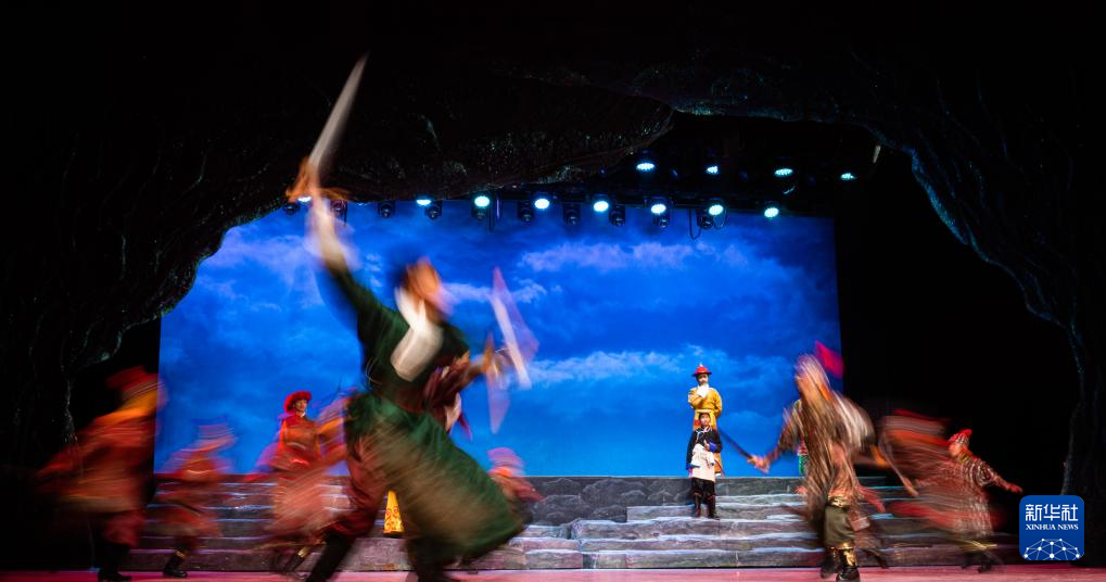這是西藏首部少兒舞臺(tái)劇藏戲《頓月頓珠》演出現(xiàn)場(chǎng),羅桑朗覺(右三)在劇中飾演“頓月”(2月11日攝)。新華社記者 丁增尼達(dá) 攝