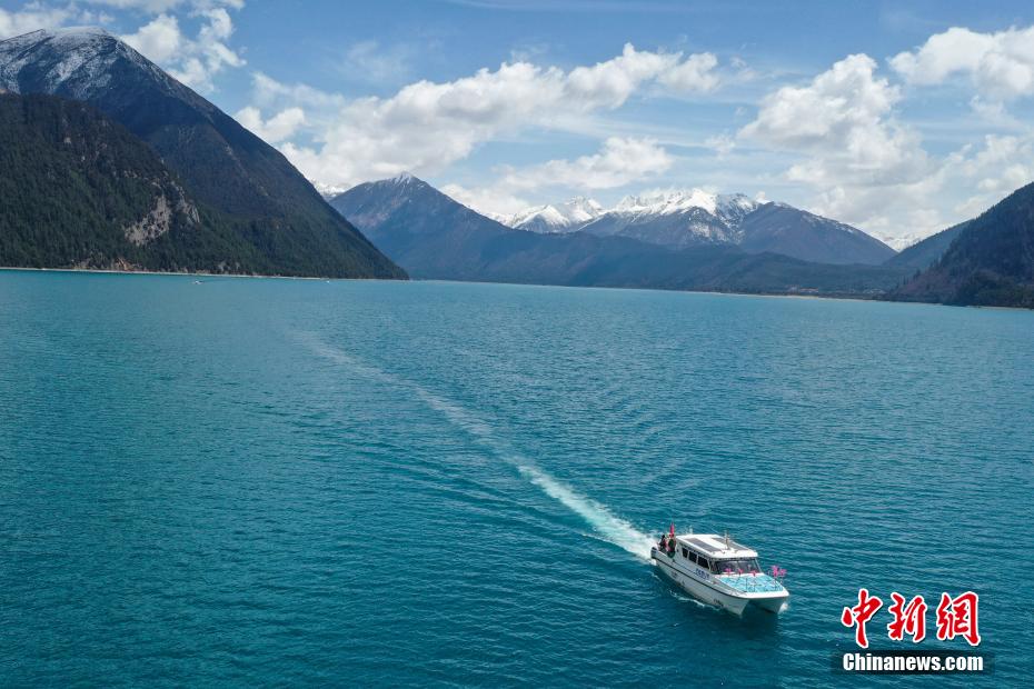 4月6日,西藏林芝工布江達(dá)縣巴松措景區(qū)游人如織。春日里,湛藍(lán)湖水與巍峨雪山相映成趣,游客游玩湖心島或乘船游覽,沉醉在這湖光山色中。圖為巴松措里的游船。中新社記者 貢嘎來(lái)松 攝
