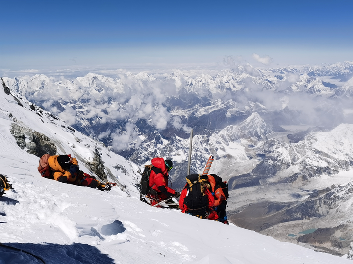 2020年5月27日,2020珠峰高程測(cè)量登山隊(duì)成功登頂世界第一高峰珠穆朗瑪峰。他們?cè)诜屙斬Q立覘標(biāo),安裝GNSS天線,開展各項(xiàng)峰頂測(cè)量工作。新華社特約記者 扎西次仁 攝