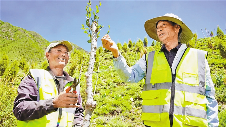 在2號片區(qū),一支特殊養(yǎng)護隊伍映入眼簾。十幾位藏族村民在技術(shù)員的指導(dǎo)下修剪枝條,掌握技術(shù)后將成為專業(yè)管護人員。村民的動作略顯生疏,但專注的神情流露出對樹苗的珍視。