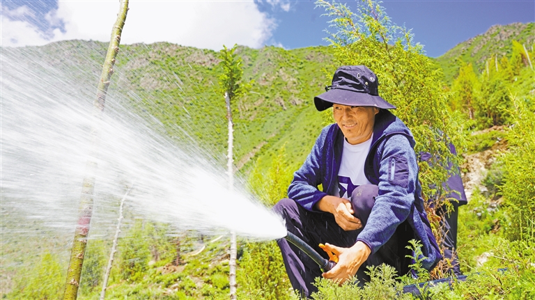 南北山綠化工程墨竹工卡縣段1號片區(qū)養(yǎng)護員給苗木澆水。