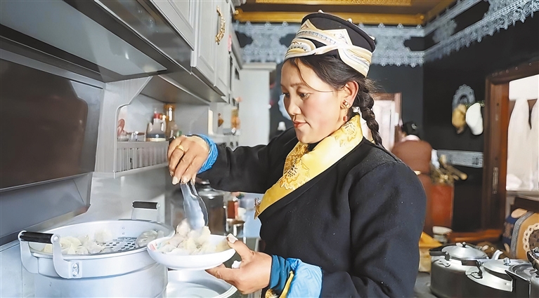 走進(jìn)村民堅阿措姆的家中,300多平方米的新房擁有明亮通透的客廳、設(shè)施齊全的衛(wèi)生間,她正在嶄新的廚房里忙著盛裝熱氣騰騰的牛肉包子招待客人。堅阿措姆的父親扎西歐珠介紹說:“我們是2024年底搬到新房子的。家里三代都住在一起,有8口人。以前一家人全擠在兩間房里,現(xiàn)在每個人都有了自己的房間,我們都非常高興?!闭勂鹦路?,他激動不已,掩飾不住內(nèi)心的喜悅。
