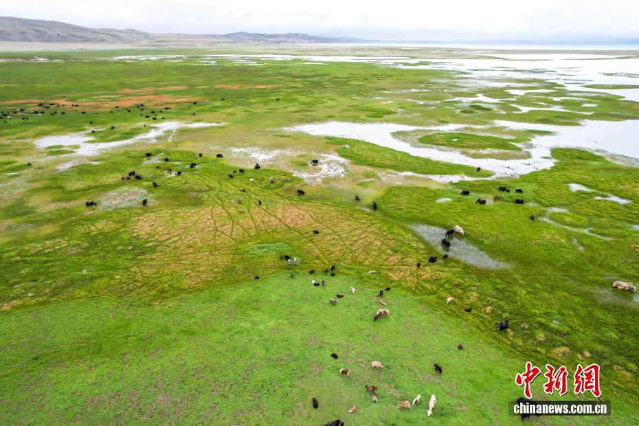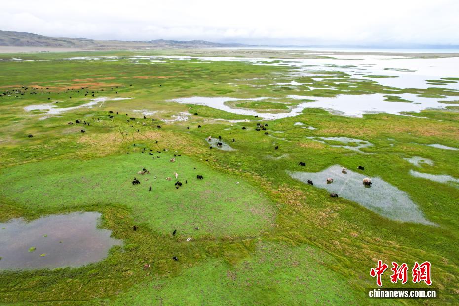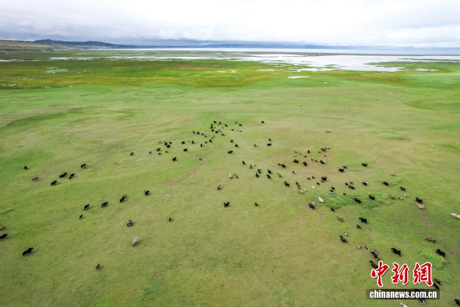 7月22日,在西藏阿里地區(qū)普蘭縣霍爾鄉(xiāng),牧民在瑪旁雍錯濕地上放牧牦牛。為實現(xiàn)更大的經(jīng)濟效益,霍爾鄉(xiāng)近年來探索建立牦牛養(yǎng)殖專業(yè)合作社,按當?shù)刈匀粭l件合理分配牦牛放牧地點,并將牛奶進行加工銷售,2023年該合作社的年總收入達到60余萬元人民幣,帶動牧民人均增收2萬余元人民幣。(無人機照片)中新社記者 張祥毅 攝