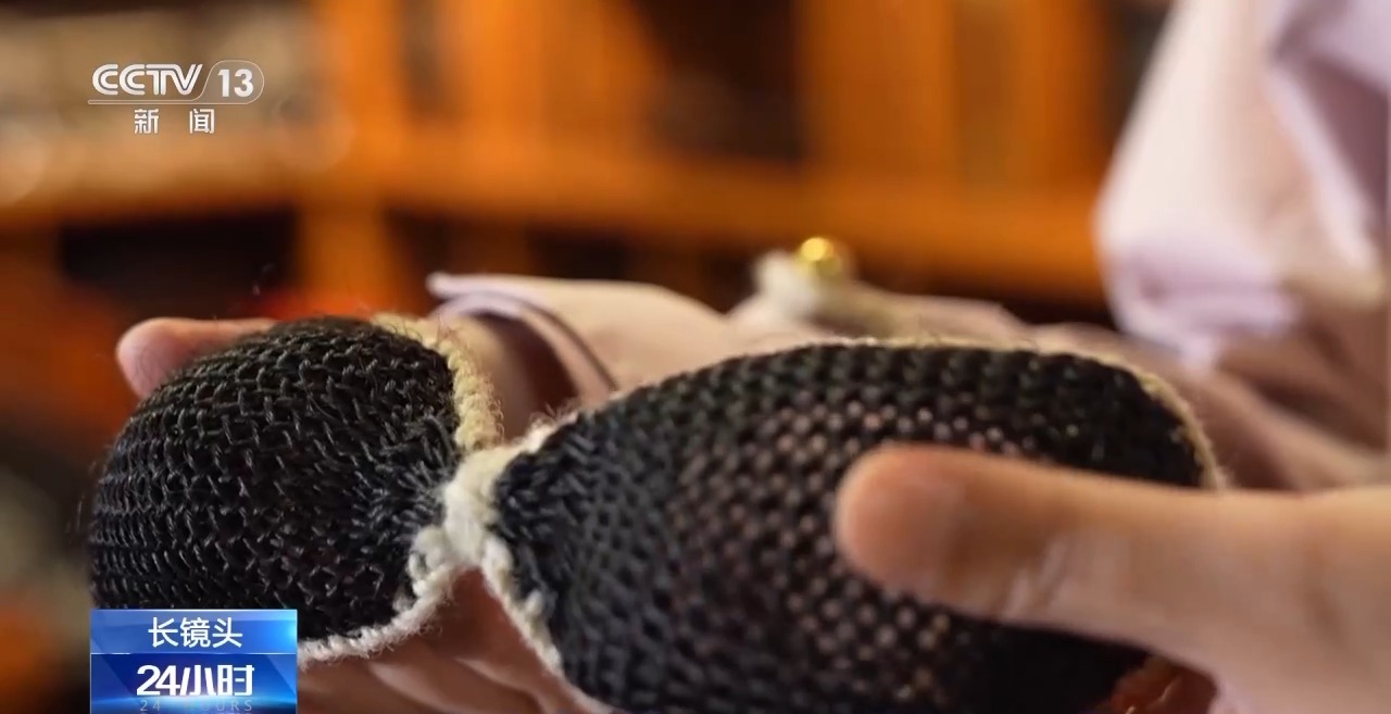 總臺記者發(fā)現(xiàn)了一副用牦牛毛編織的墨鏡。以前牧民非常有智慧,他們在雪天會帶上牦牛毛編織的墨鏡,防止白雪刺眼。記者戴上之后,可以非常清楚地看到遠方。