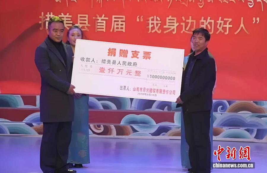 2018年,晉美在措美縣首屆春節(jié)、藏歷新年晚會(huì)上,向措美縣捐贈(zèng)1000萬元扶貧資金,助力脫貧攻堅(jiān)工作。 受訪者供圖
