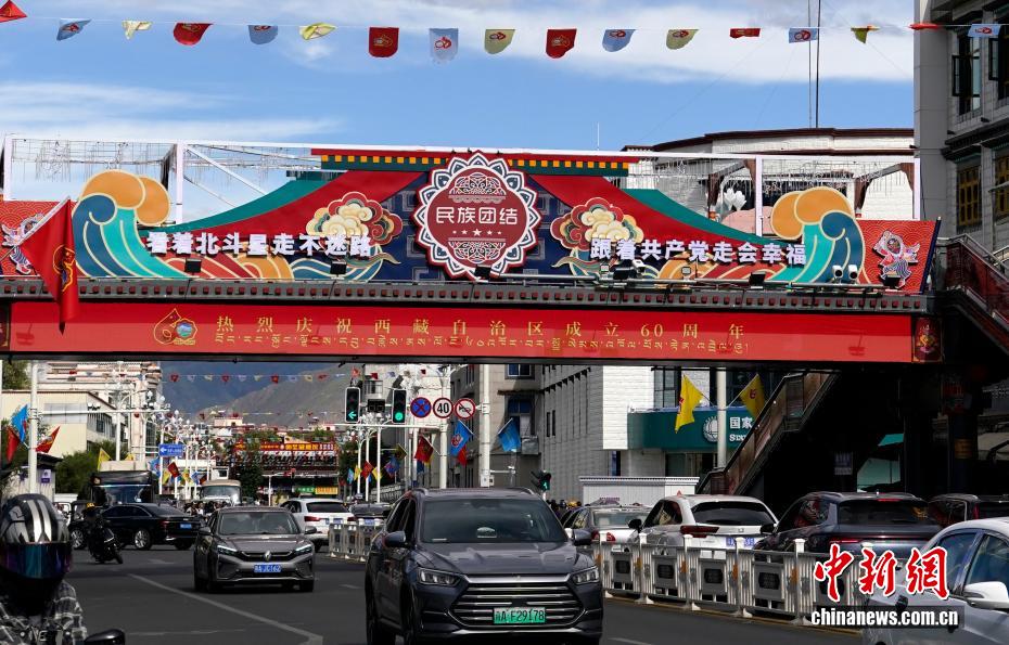 8月19日,隨著西藏自治區(qū)成立60周年慶?;顒优R近,拉薩氛圍濃。拉薩街頭,處處是張燈結(jié)彩的盛景,洋溢著一派祥和與歡騰的氛圍。圖為拉薩裝扮一新的人行天橋。中新社記者 李林 攝