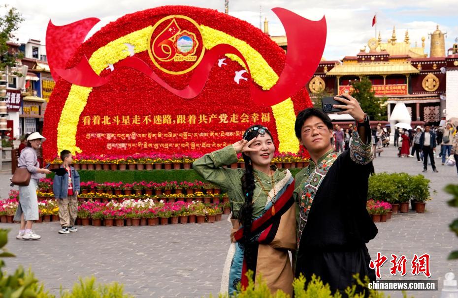 8月19日,隨著西藏自治區(qū)成立60周年慶?;顒优R近,拉薩氛圍濃。拉薩街頭,處處是張燈結(jié)彩的盛景,洋溢著一派祥和與歡騰的氛圍。圖為游客在拉薩大昭寺廣場上的大慶宣傳標(biāo)語前留念。中新社記者 李林 攝