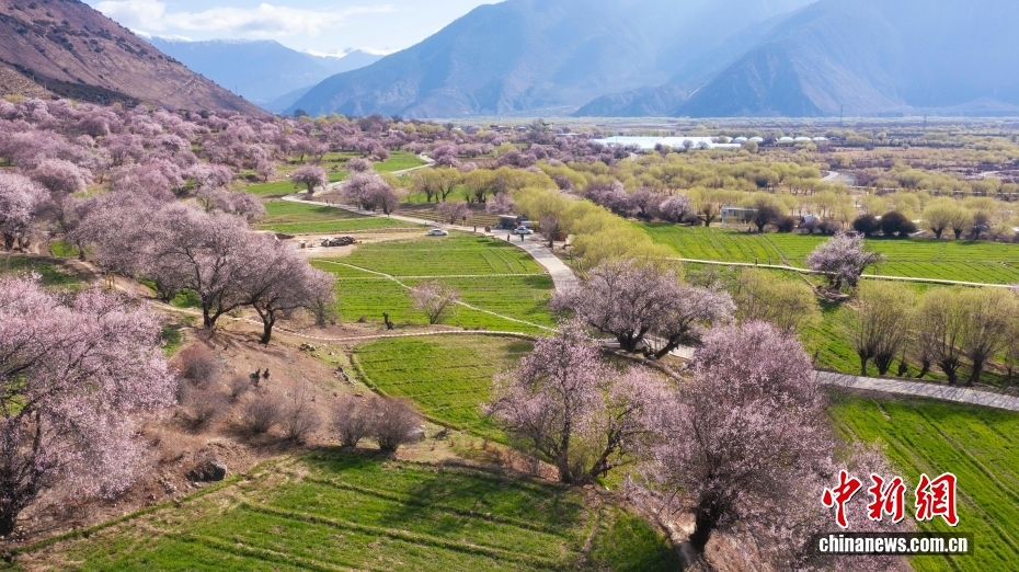 位于西藏拉薩北部山坳里的古剎帕邦喀周圍桃花盛開,吸引眾多游客前來觀光拍照。圖為帕邦喀周圍盛開的桃花和遠處的布達拉宮。中新社記者 貢嘎來松 攝