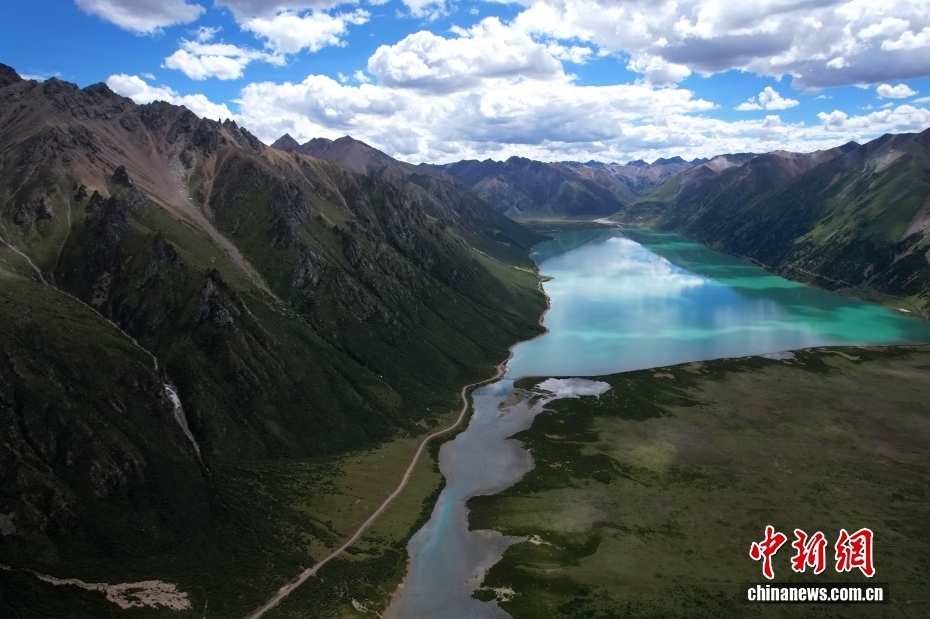 西藏那曲市,嘉乃玉錯國家濕地公園碧波蕩漾,湖邊綠意盎然,在藍天白云映襯下,景色如畫。(無人機照片)中新社記者 李林 攝