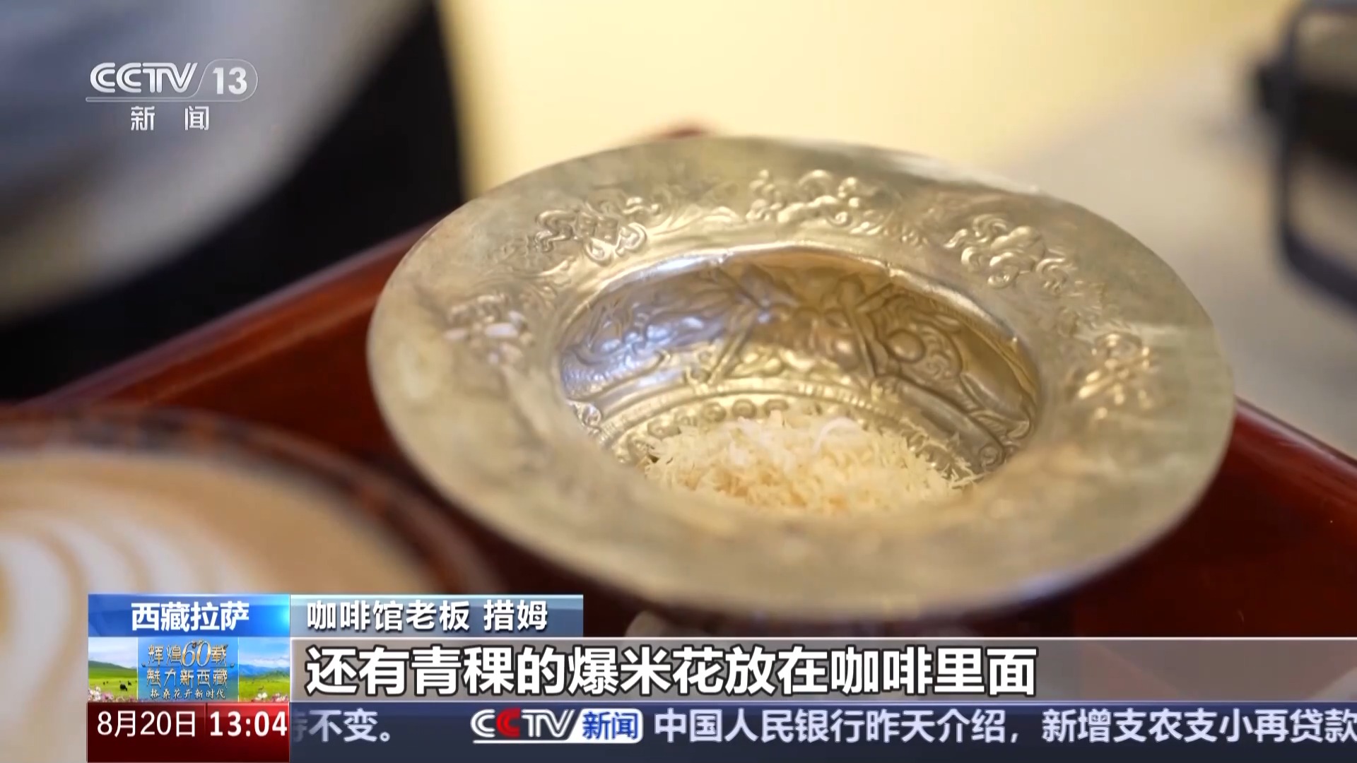 咖啡館老板 措姆:這款是我們店里面賣得最火爆的一款原創(chuàng)產(chǎn)品——拉薩拿鐵,我們準(zhǔn)備了牦牛奶的奶渣、酥油、青稞的爆米花放在咖啡里,讓客人體驗(yàn)到西藏本地食材和咖啡融合的感覺(jué)。